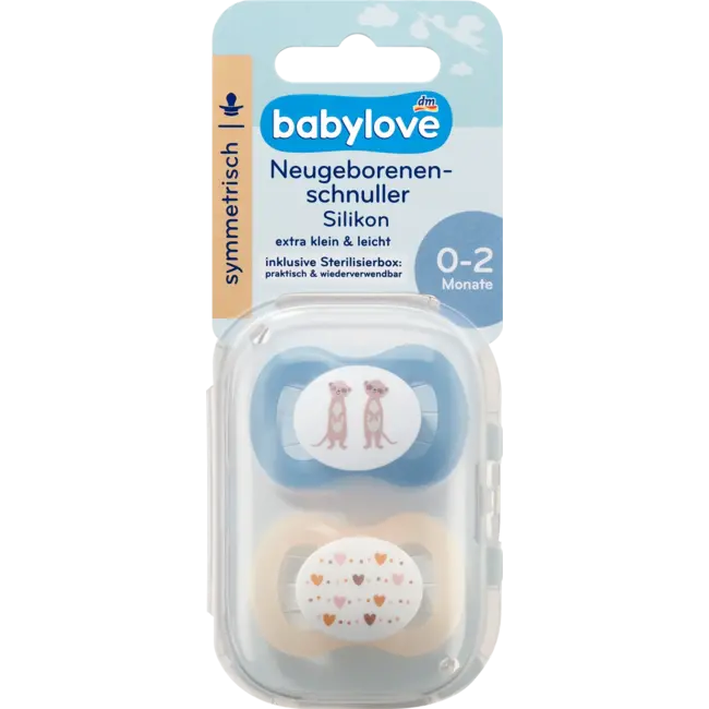 De babylove newborn fopspeen (meerkat/hartmotief) is speciaal ontwikkeld voor pasgeborenen. De extra kleine en lichte speenschijf past zich proportioneel aan het kleine gezichtje van de baby aan. Het extra kleine, symmetrische siliconen zuiggedeelte ondersteunt de natuurlijke kaakontwikkeling en bevordert het drink- en zuiggedrag in de eerste weken. De praktische transport- en sterilisatiebox is ideaal voor het bewaren van fopspenen en het steriliseren van fopspenen in de magnetron.