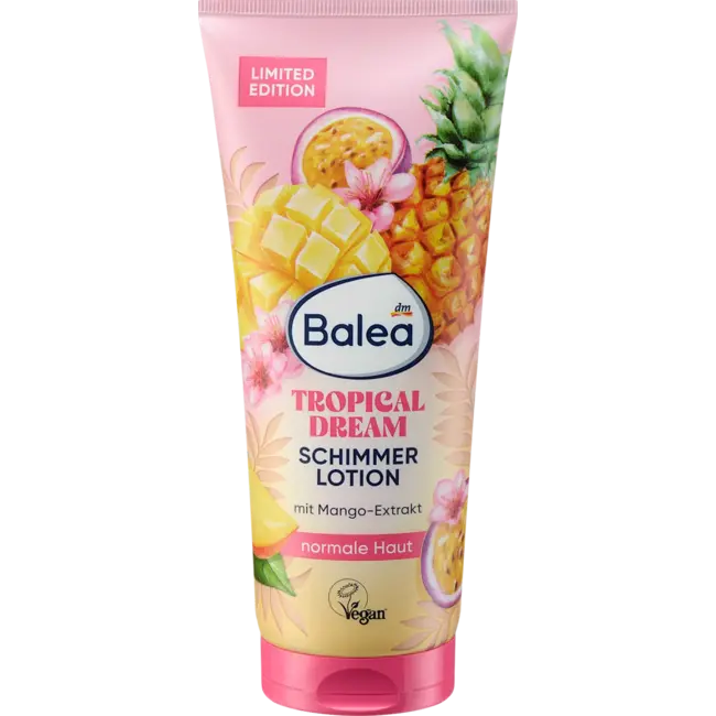 Balea's Tropical Dream glinsterende bodylotion voedt de huid en geeft haar een stralende gloed. De verzorgende formule met exotisch mango-extract hydrateert de huid en maakt haar merkbaar soepel. Fijne glinsterende deeltjes weerkaatsen het licht, waardoor een subtiele, zomerse gloed ontstaat die de huid een zongebruinde uitstraling geeft. Een heerlijke dagelijkse verwennerij die de zintuigen meevoert naar een tropische droomwereld.