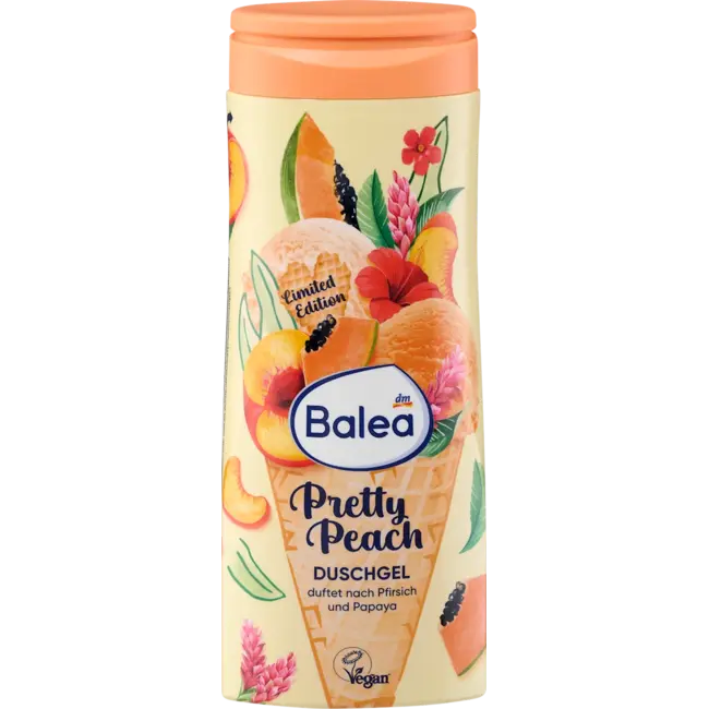 Voor een verfrissende zomerdouche probeer je Balea's Pretty Peach douchegel. De fruitige geur, die doet denken aan een kleurrijke ijscoupe, combineert zoete perzik met tropische papaja en roept een gevoel van puur plezier op. De pH-neutrale en veganistische formule is bijzonder zacht voor de huid en zelfs geschikt voor de gevoelige huid. Een verfrissende douche-ervaring die je zintuigen meeneemt op een reis vol vrolijkheid.