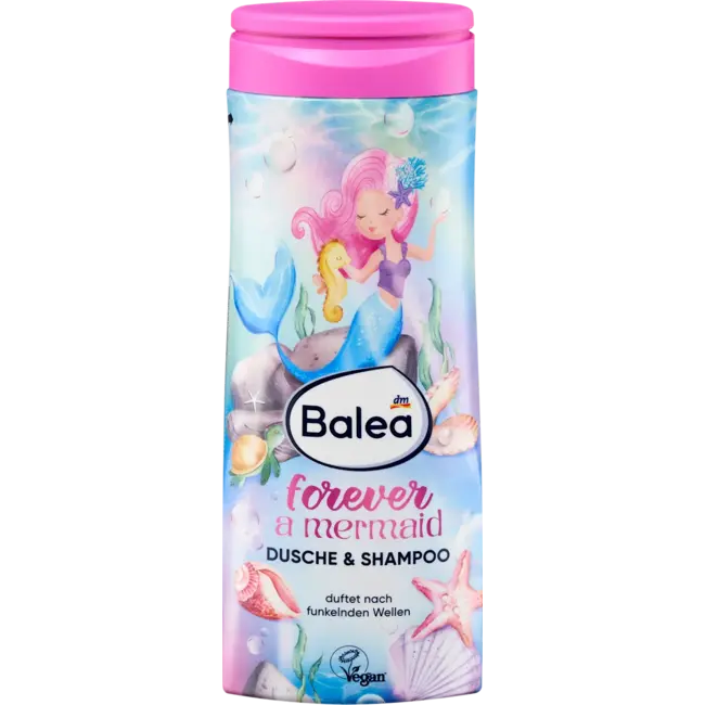 Balea's 2-in-1 Forever a Mermaid kinderdouchegel en -shampoo, geschikt voor kinderen vanaf drie jaar, creëert een magisch onderwateravontuur. Met zijn betoverende geur van sprankelende golven nodigt het kinderen uit om te dromen en reinigt het, als praktisch 2-in-1 product, op milde wijze van top tot teen. De milde formule is speciaal ontwikkeld voor de behoeften van de gevoelige kinderhuid. Het voedt de huid, beschermt tegen uitdroging en is bijzonder zacht.