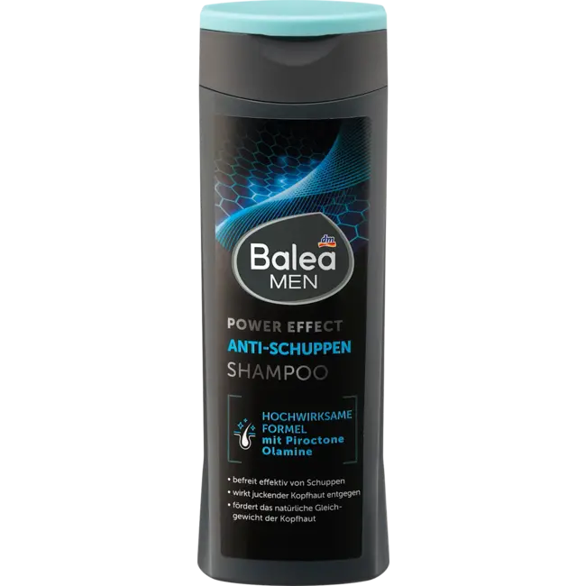 Balea MEN's Power Effect Anti-Roos Shampoo zorgt voor een frisse hoofdhuid en prachtig haar. De speciale formule met menthol en appelmuntextract verfrist de hoofdhuid en gaat onaangename jeuk tegen. Zichtbare roos kan effectief worden verminderd vanaf de eerste wasbeurt*. De zeer effectieve formule met Piroctone Olamine bestrijdt roos langdurig en voorkomt bij regelmatig gebruik terugkeer**. Voor een verzorgde hoofdhuid en sterk, schilfervrij haar.