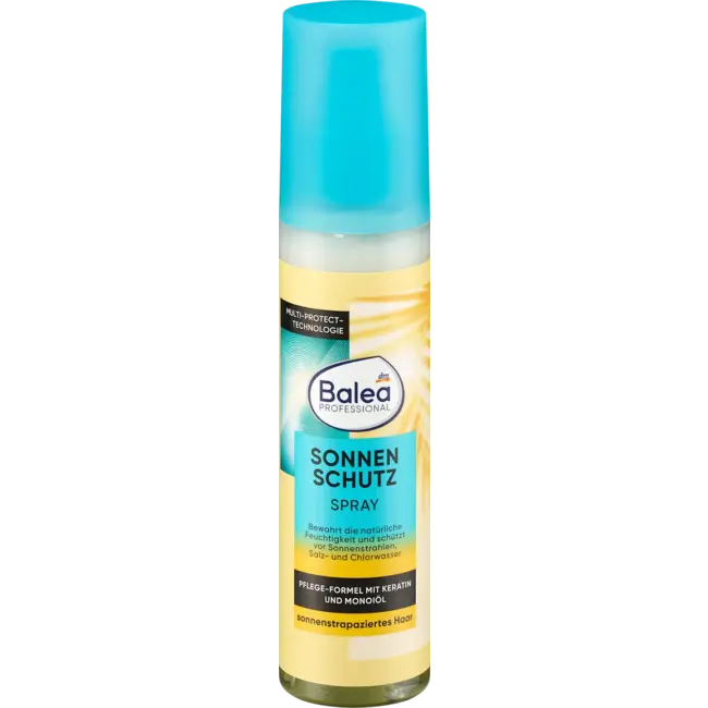 De Balea PROFESSIONAL Sun Protection Spray biedt effectieve bescherming voor door de zon beschadigd haar. Dankzij de speciale verzorgende formule met keratine en monoi-olie voelt het haar glad, verzorgd en makkelijk doorkambaar aan. De innovatieve Multi-Protect-technologie beschermt niet alleen tegen schadelijke zonnestralen, maar behoudt ook de natuurlijke vochtigheid en beschermt tegen uitdroging en verkleuring door zout en chloorwater.