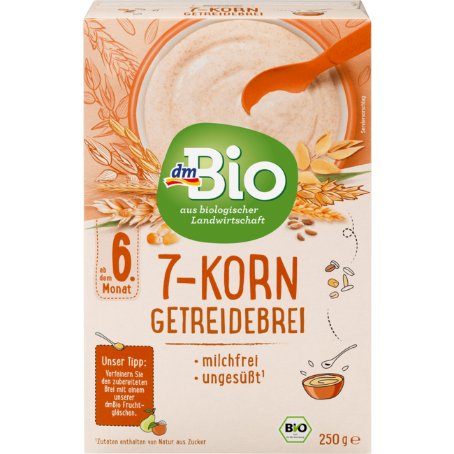 Onze dmBio 7-granenpap is ideaal als tussendoortje vanaf de 6e maand, als onderdeel van een evenwichtige, gemengde voeding en als aanvulling op borstvoeding of flesvoeding. De pap is makkelijk te bereiden, smaakt puur en kan eventueel nog verfijnd worden met onze dmBio fruitpotten (bijvoorbeeld appel-framboos-banaan).