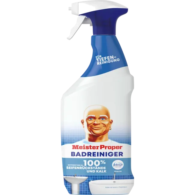 De Meister Proper badkamerreiniger combineert de reinigende kracht van Meister Proper met de frisheid van Febreze om uw badkamer in een mum van tijd een langdurige glans en aangename frisheid te geven. Met zijn kalkverwijderende kracht verwijdert Meister Proper tot 100% zeepresten en kalkaanslag. Nu twee keer zo krachtig in het verwijderen van kalkaanslag vergeleken met de vorige Meister Proper badkamerreiniger spray. Bovendien beschermt de formule tegen watervlekken en nieuwe zeepaanslag, waardoor uw badkamer langer schoon blijft. Deze badkamerreiniger kan eenvoudig op alle badkameroppervlakken worden gebruikt: badkuipen, linoleum, douches, wastafels, toiletten, tegels en kranen.