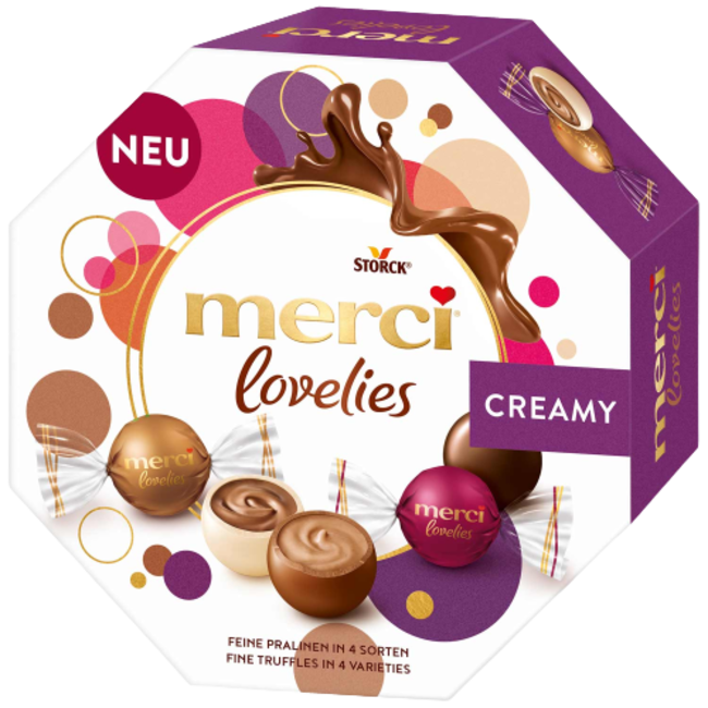 Rond genot met een romige kern. De heerlijke merci lovelies Creamy verleiden niet alleen met hun delicate smelt, maar ook met hun volle smaak. Een krokant omhulsel van drie verschillende soorten chocolade omsluit een fijne kern met een zoete roomvulling die heerlijk wegsmelt in je mond. Een waar genoegen voor de mooie momenten in het leven. De verpakking meet ca. 15 x 15 x 5 cm en bevat de volgende varianten: