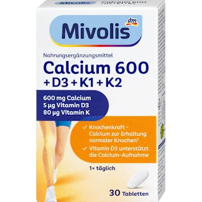 Mivolis Calcium 600+Vitamine D3+Vitamine K1+K2 bevat belangrijke bouwstenen voor normale botten. • Calcium is nodig voor het behoud van normale botten en tanden en draagt bij tot de normale spierfunctie. Gezien bepaalde voedingsgewoonten of levenssituaties wordt echter niet altijd via voedsel aan de calciumbehoefte voldaan. • Vitamine D draagt bij tot het behoud van normale botten en tanden. • Vitamine K ondersteunt het behoud van normale botten. Een voedingssupplement met Mivolis Calcium 600+Vitamine D3+Vitamine K1+K2 kan bijzonder nuttig zijn: • tijdens zwangerschap en borstvoeding • Tijdens groeifasen bij adolescenten • met een onevenwichtige voeding.
