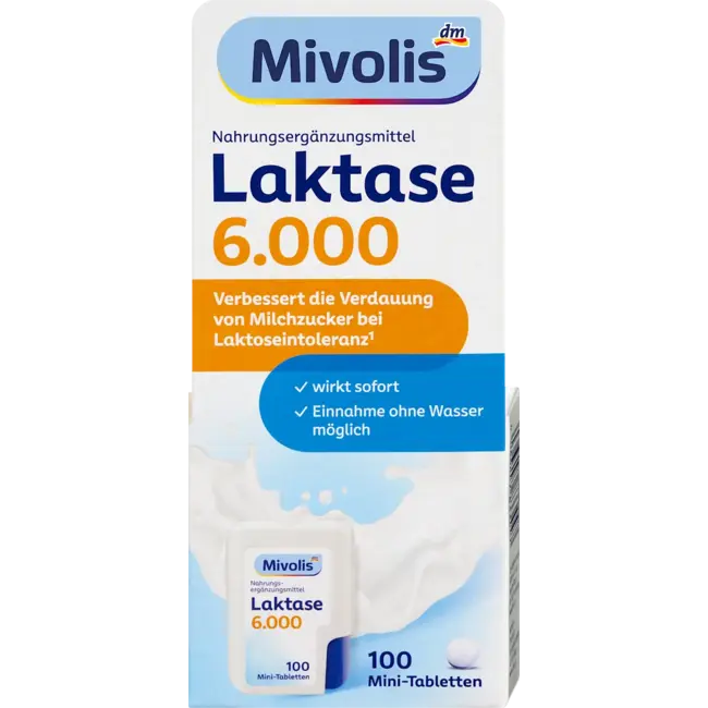 Lactose (melksuiker) wordt in tal van voedingsmiddelen aangetroffen. In het geval van lactose-intolerantie zijn de levenskwaliteit en het genot van de getroffenen ernstig beperkt, omdat de onverteerde lactose leidt tot spijsverteringsproblemen met verhoogde gasvorming en winderigheid in de maag en darmen. Het lichaam kan de lactose uit voedsel niet benutten omdat het het lichaamseigen lactase-enzym mist. Mivolis Lactase 6.000 neemt de functie van het lichaamseigen lactase-enzym over en ondersteunt effectief de vertering van lactose. Lactase werkt in de maag en darmen. Het breekt de lactose uit voedsel veilig af. Door de enzymwerking biedt Mivolis Lactase 6.000 een bijzonder hoog niveau van veiligheid en betrouwbaarheid. De praktische dispenser is ideaal voor onderweg.