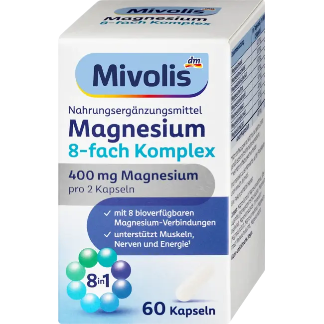 Als bestanddeel van enzymen is magnesium een essentieel mineraal dat betrokken is bij meer dan 300 stofwisselingsprocessen in het lichaam. Magnesium komt voor in verschillende vormen, die elk op een andere manier worden gemetaboliseerd. Mivolis Magnesium 8-voudig Complex bevat acht optimaal uitgebalanceerde, biologisch beschikbare magnesiumverbindingen. *Magnesium draagt bij aan een normale spierfunctie, een normale werking van het zenuwstelsel en een normale energiestofwisseling. Magnesium draagt ook bij aan het verminderen van vermoeidheid.