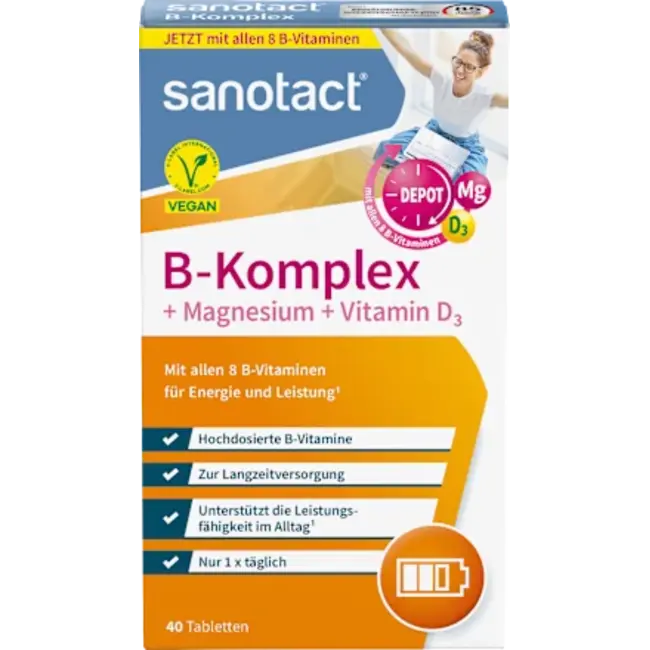 De sanotact B-complex + magnesium + vitamine D3 tabletten bevatten verschillende B-vitamines en magnesium. Pantotheenzuur, niacine, vitamine B2, B6, B12 en magnesium kunnen bijdragen aan een vermindering van vermoeidheid en een normaal energiemetabolisme.