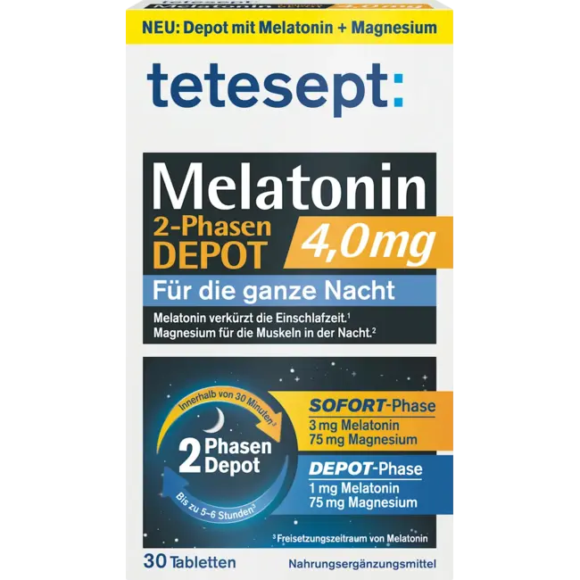 Tetesept Melatonine 2-fasen Depot 4 mg combineert innovatieve 2-fasen technologie met een hoge dosis melatonine en magnesium. De fase met onmiddellijke afgifte geeft binnen 30 minuten 3 mg melatonine af, wat kan helpen om de tijd die nodig is om in slaap Lees meer.