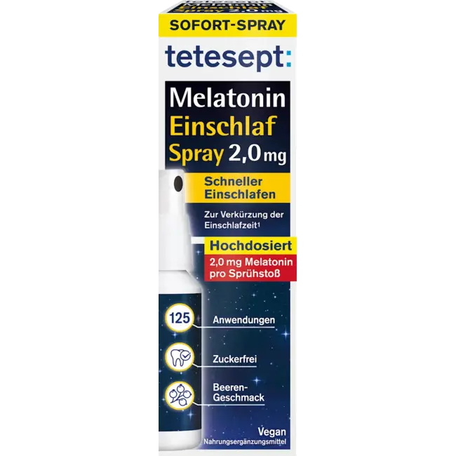 De Tetesept Melatonine Spray 2 mg biedt een handige oplossing voor de snelle opname van melatonine via het mondslijmvlies. Slechts één spray geeft 2,0 mg melatonine af, wat kan helpen om sneller in slaap te vallen. De heerlijke bessensmaak maakt het gebruik extra aangenaam. Dankzij de directe opname via het mondslijmvlies is de melatonine snel beschikbaar. Ideaal voor een gemakkelijke en veilige dosering.